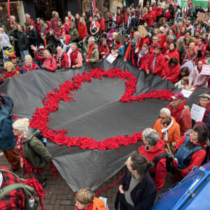 Tijdens de vijf dagen van het voorlezen werd voor elke genoemde naam een stuk rode stof geknoopt. Zo maken we niet alleen hoorbaar maar ook zichtbaar om hoeveel mensen het gaat; een vervolg in verbinding.