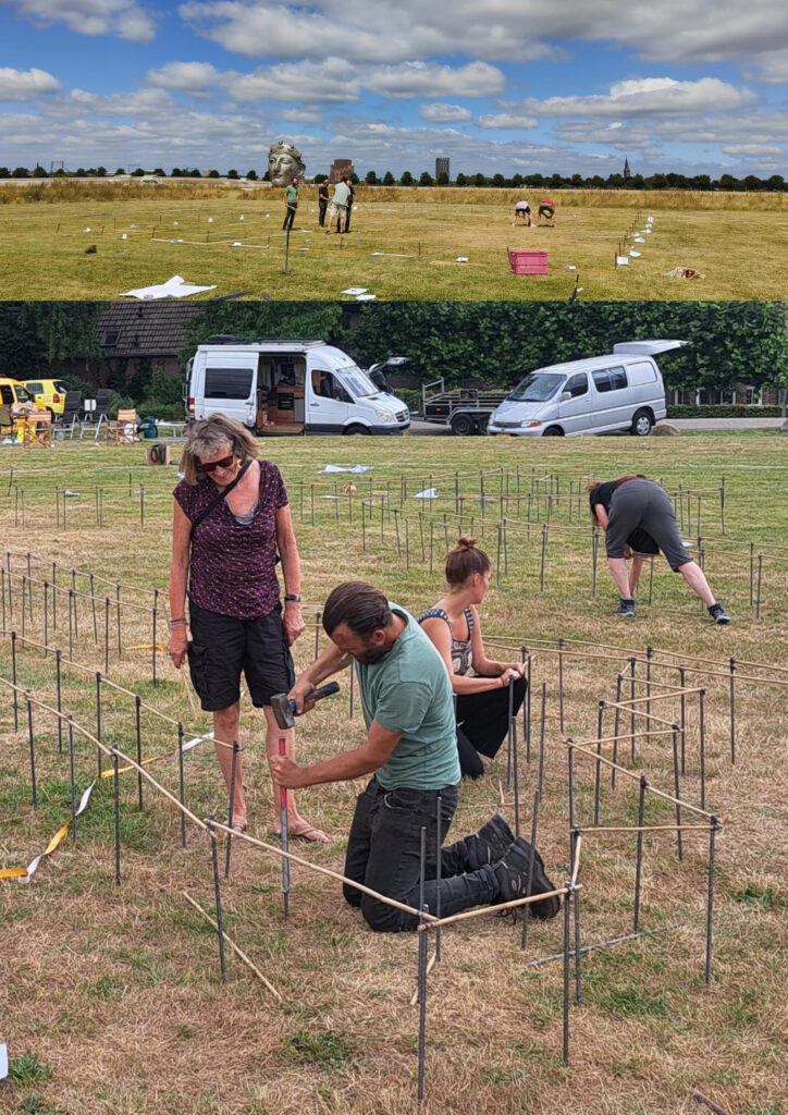 De contouren van de duif worden op 17 april zichtbaar gemaakt met betonijzers en bamboestokken.